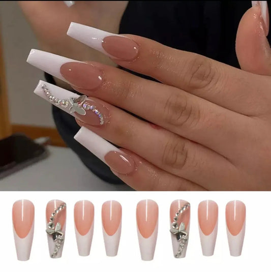 24 pcs Set Long False Nails - White Tips with Rhinestone Accent