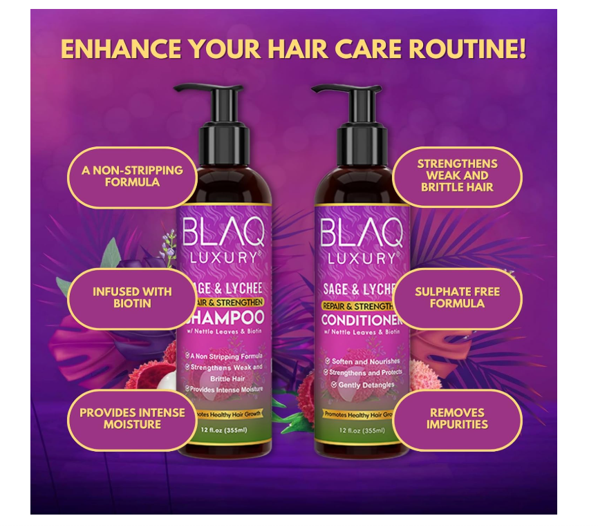 - Our Shampoo and Conditioner are infused with sage, lychee, biotin, and nettle extracts to promote healthy hair and hair repair. Biotin strengthens and fortifies hair strands, making them healthier and more resilient while nettle extract provides essential nutrients for nourishing the hair and scalp.