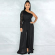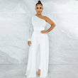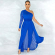 Solid Color Sexy Mesh See-through One Shoulder Diagonal Collar Long Sleeve Trousers Jumpsuit Women