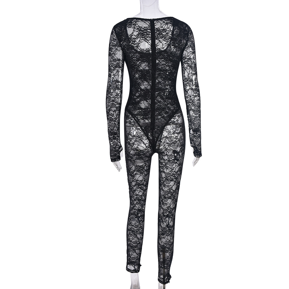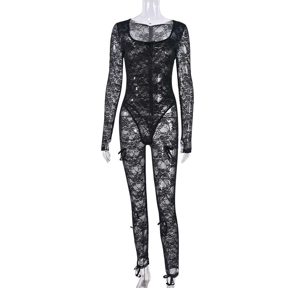 Summer Women Clothing U Neck Long-Sleeved Sexy Lace Stretch Jumpsuit Women