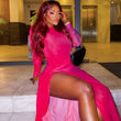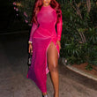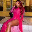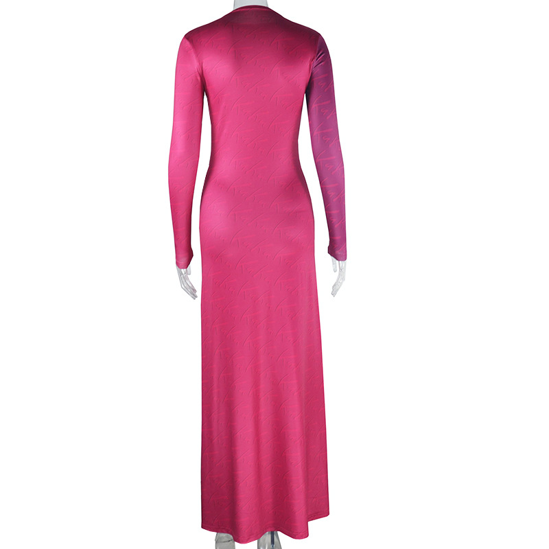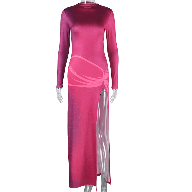 Women Clothing Solid Color Dress Sexy round Neck Long Sleeve High Slit One Step Dress